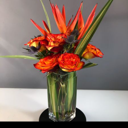 This bright neotropical arrangement made to last is perfect for the sophisticated flower lover in your life. Bright and vivid reminds us of summer days and days by the pool or on the sands of Hawaii where these mini Heliconia are native.
