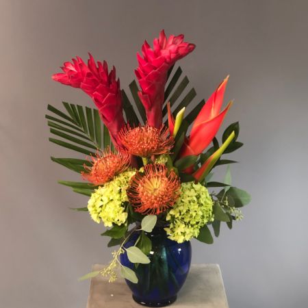 This homage to all the tropical vacations that we have ever taken is directly from Hawaii and has some beautiful tropical flowers that will be long lasting and suitable for anyone’s home. This tropical vase is cobalt blue and 6" tall by 5" opening.